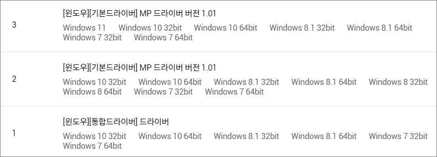 드라이버 파일 목록에 3개 파일이 나오네요. 지원하는 운영체제를 잘 살펴보시면 윈도우 11 운영체제를 지원하는 파일은 3번 파일밖에 없습니다. 3번 파일을 클릭해서 다운로드를 해주세요.